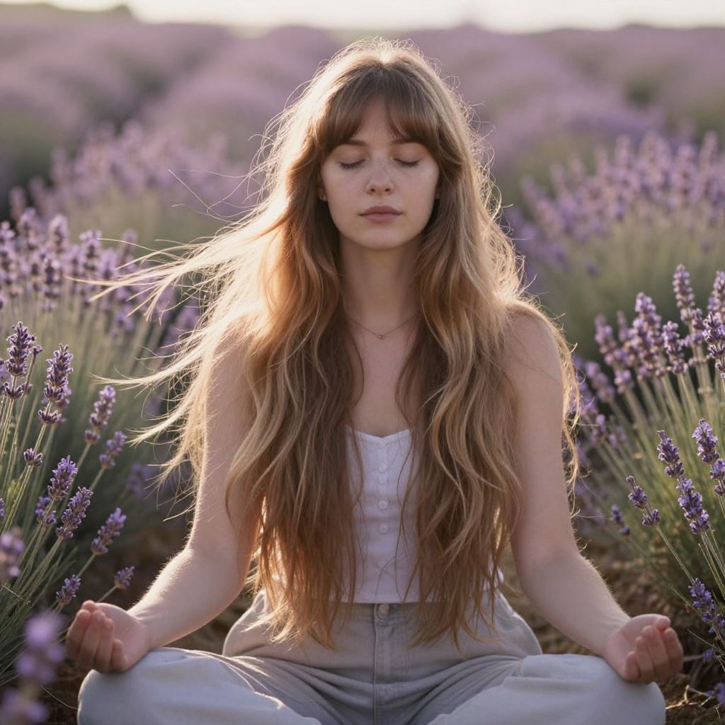 A young woman with long flowing hair sits cross-legged in a serene lavender field, meditating with her eyes closed. The soft sunlight enhances the tranquil atmosphere, highlighting the natural beauty of the lavender blooms surrounding her. This peaceful moment captures a harmonious connection between nature and mindfulness.