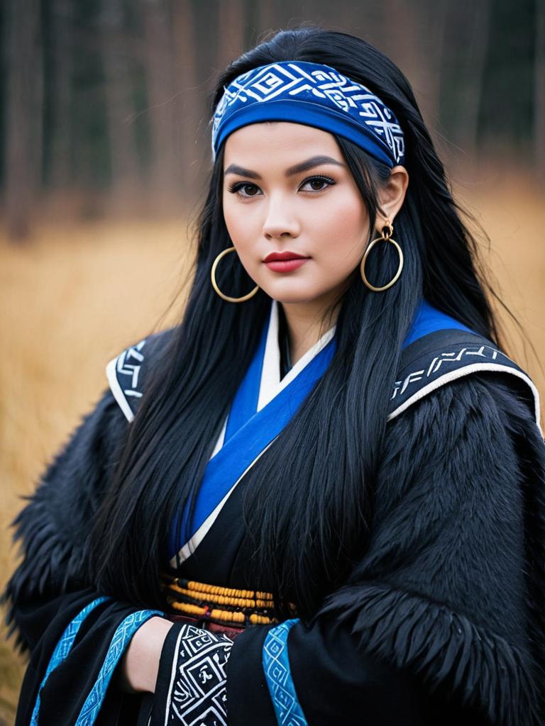 Indigenous Woman Wearing Traditional Blue and Black Attire with Headband