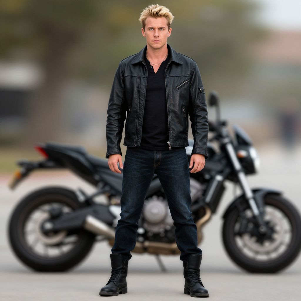 A young man with blonde hair stands confidently in front of a modern motorcycle, dressed in a black leather jacket, dark jeans, and black boots. The background is softly blurred, emphasizing the subject and his bike, evoking a rugged and stylish biker aesthetic.