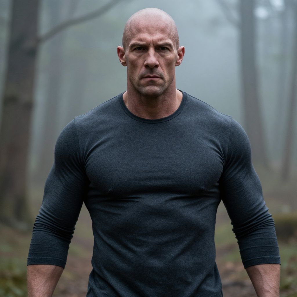 A muscular bald man with a serious expression stands outdoors in a misty forest setting, wearing a fitted dark long-sleeve shirt. The image captures a moody and intense atmosphere with soft natural lighting and shallow depth of field highlighting the subject's strong physique.