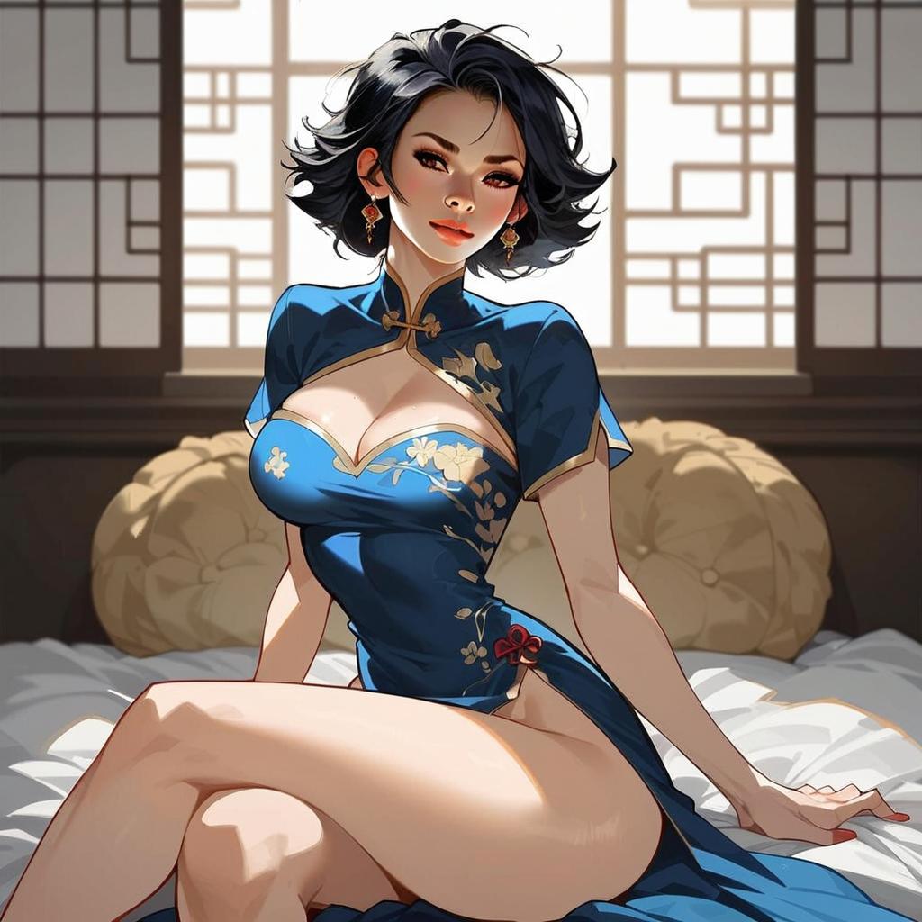 This digital artwork features a confident woman with short black hair sitting gracefully on a bed in a traditional blue cheongsam adorned with gold floral embroidery. The piece showcases a sophisticated anime-inspired style with sharp details and a warm, softly lit background featuring classic Asian architectural elements.