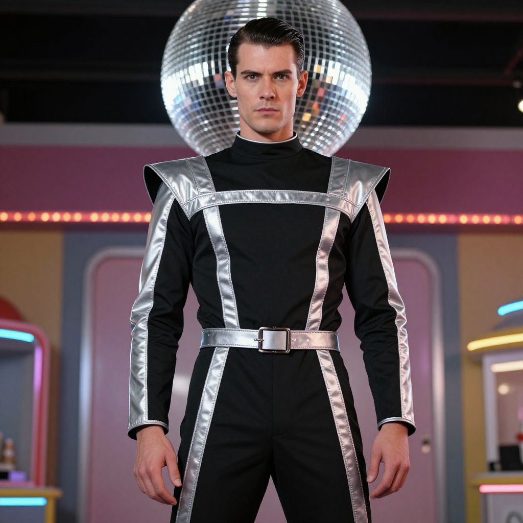 A man stands confidently wearing a futuristic black and silver metallic suit, reminiscent of classic sci-fi uniforms. Positioned in front of a large disco ball, the setting combines retro and space-age aesthetics, creating a striking modern interpretation of vintage sci-fi style.