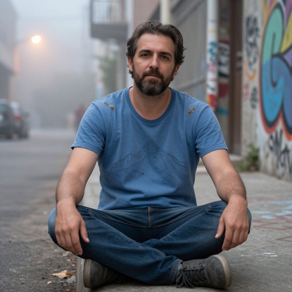 A man with a beard and casual attire sits cross-legged on an urban street, surrounded by graffiti-covered walls and a misty atmosphere. The relaxed pose and natural background create a candid and contemplative mood in this street portrait.