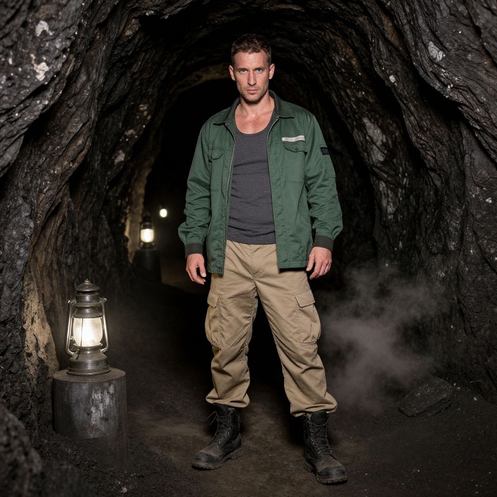 A man stands confidently in a dimly lit rocky cave, wearing a green jacket, black tank top, beige cargo pants, and black combat boots. Lanterns light the pathway behind him, and a misty fog adds an eerie atmosphere to the underground setting.