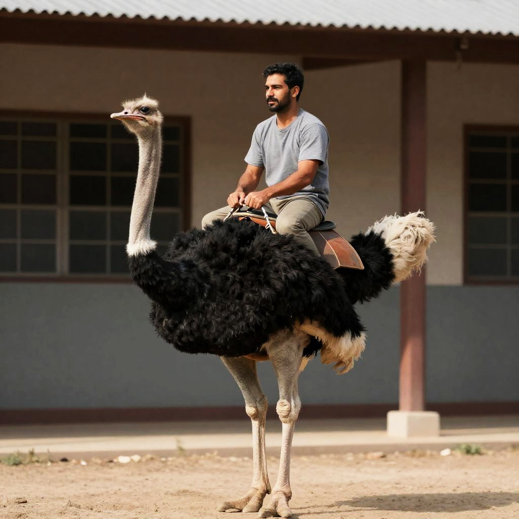 A man dressed in casual attire is riding a large black ostrich equipped with a saddle, positioned in front of a building with windows. The scene captures a unique interaction between the man and the ostrich in an outdoor setting, highlighting the unusual mode of transport.