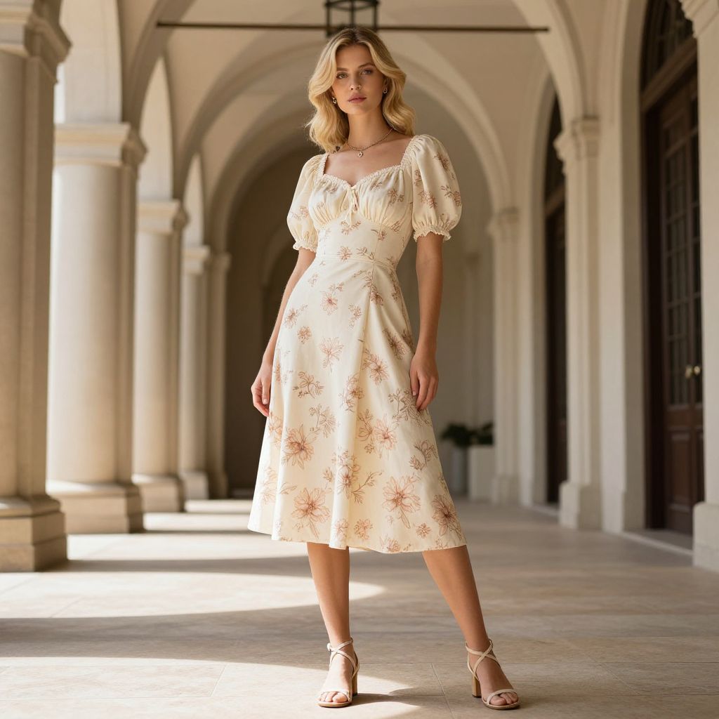 A stylish woman stands confidently in an elegant beige midi dress featuring puffed sleeves and a delicate floral print. The image captures a refined, timeless aesthetic enhanced by the architectural backdrop of arched columns and soft natural lighting.