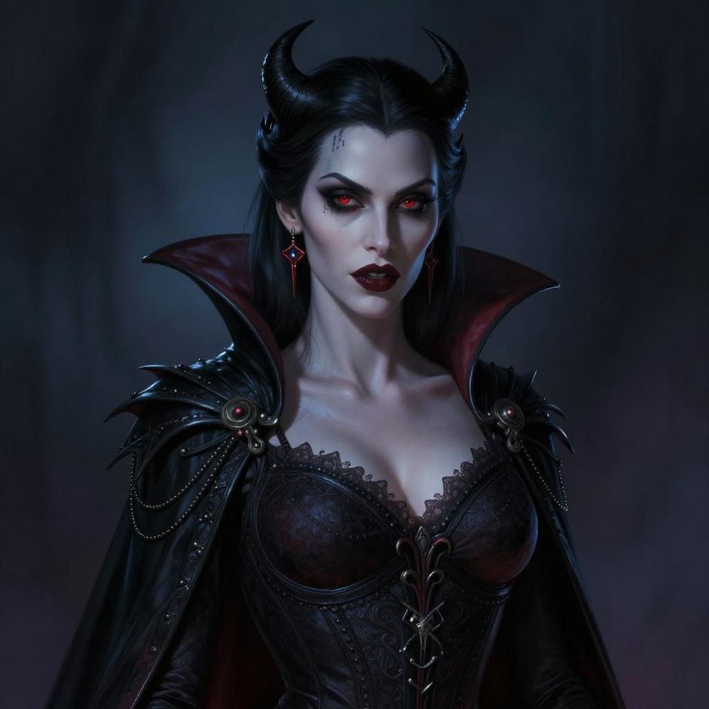 A dark, gothic woman with glowing red eyes and black horn-like headpieces stares intensely forward. She wears a detailed corset and a high-collared cape with intricate embellishments, exuding a powerful and mysterious vampire-inspired aesthetic in a realistic digital art style.