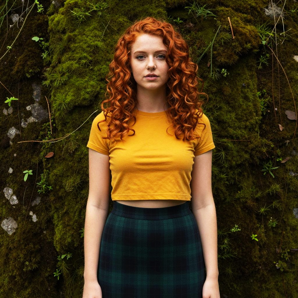 A young woman with vibrant curly red hair stands confidently against a lush green moss-covered rock background. She wears a mustard yellow cropped t-shirt paired with a dark plaid skirt, embodying a modern and casual style with natural elements.