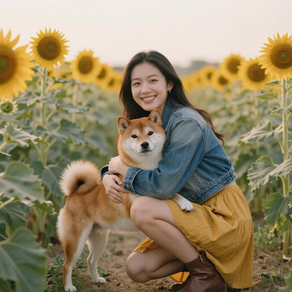 A young woman crouches and embraces a Shiba Inu dog in a vibrant sunflower field, radiating warmth and happiness. The photo's natural lighting and soft focus create a serene and joyful atmosphere, highlighting the close bond between the woman and her pet.