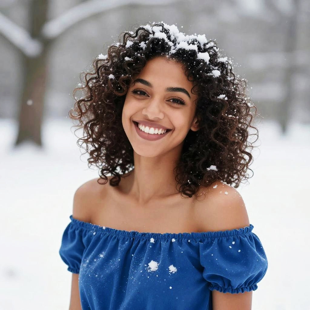 A joyful young woman with curly hair stands outdoors in a snowy landscape, her hair dusted with snowflakes. She is wearing a bright blue off-shoulder top, creating a striking contrast against the white winter background and her radiant smile.