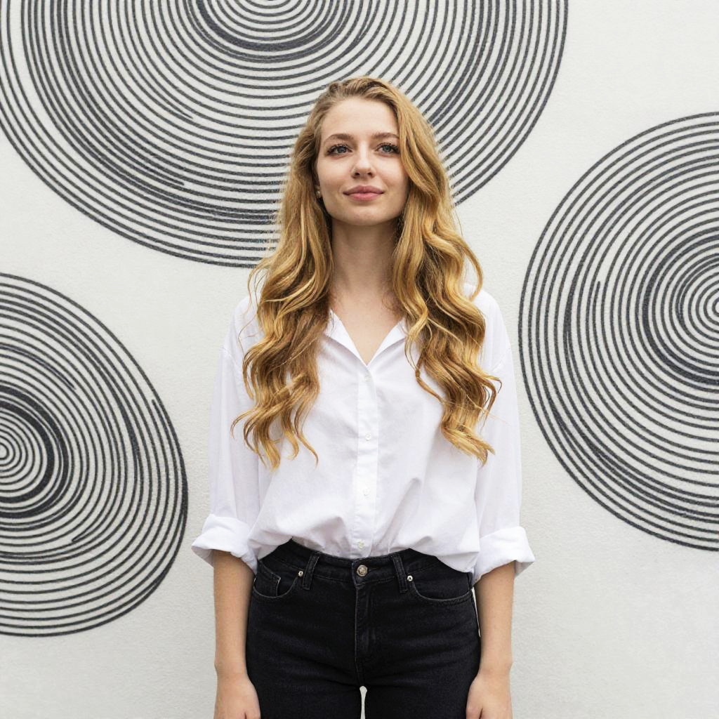 A young woman with long wavy blonde hair stands confidently against a modern mural featuring black concentric circles on a white wall. She wears a casual white button-up shirt tucked into high-waisted black jeans, blending simplicity with an artistic urban backdrop.