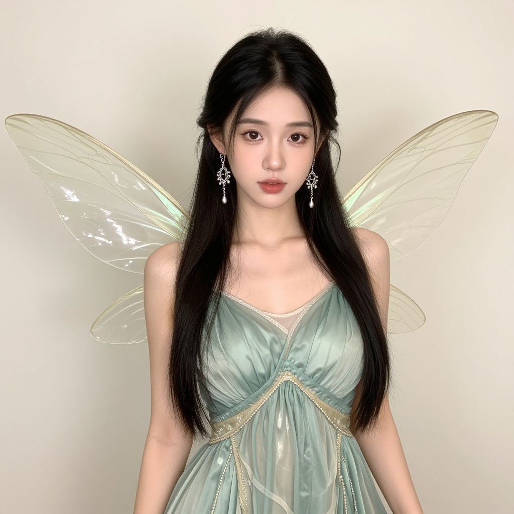 A young woman with long dark hair wears a flowing pastel green dress and translucent fairy wings, creating an ethereal and whimsical look. Her delicate appearance is complemented by intricate pearl drop earrings, set against a neutral background to highlight her serene expression and fantasy-inspired style.