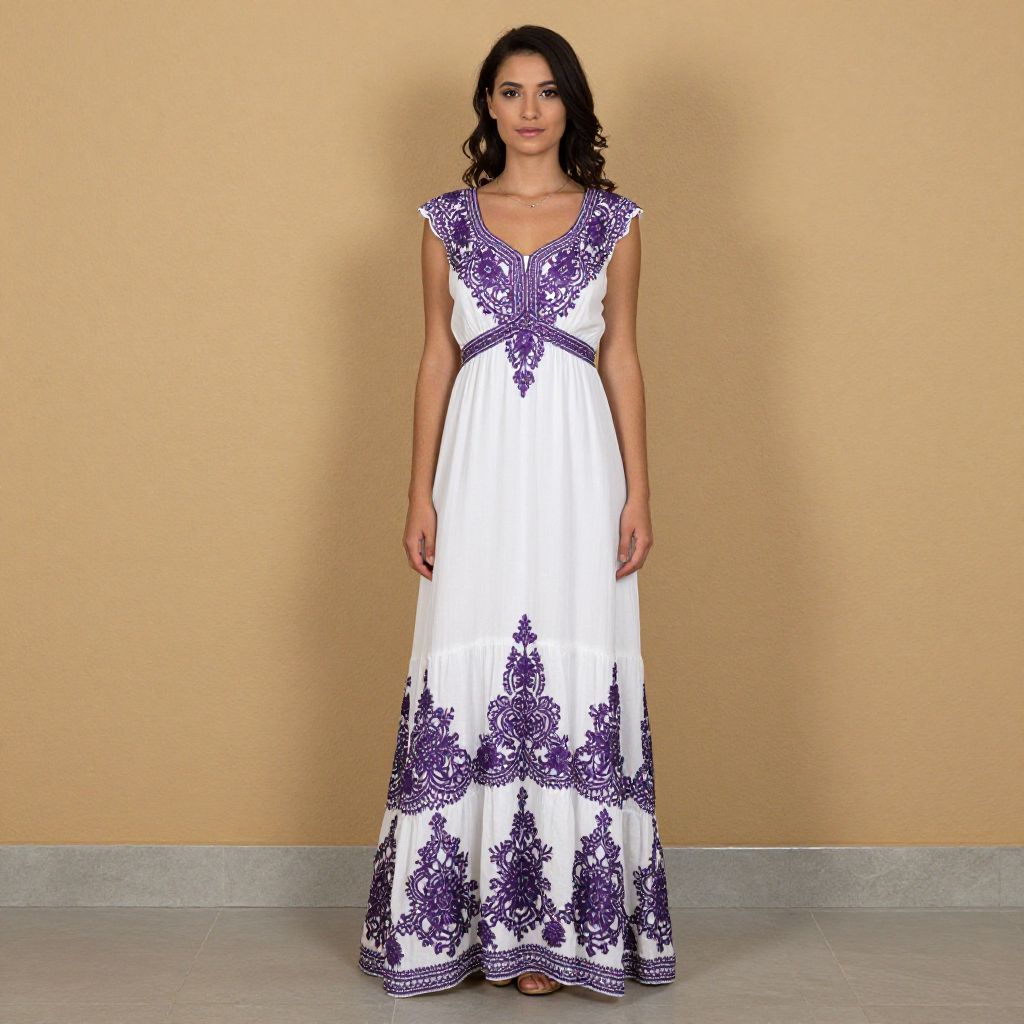 A woman stands against a beige background wearing a white maxi dress adorned with intricate purple embroidery along the neckline, waist, and hem. The dress features a sleeveless design with delicate patterns that create a boho-chic and elegant look suitable for summer or casual occasions.