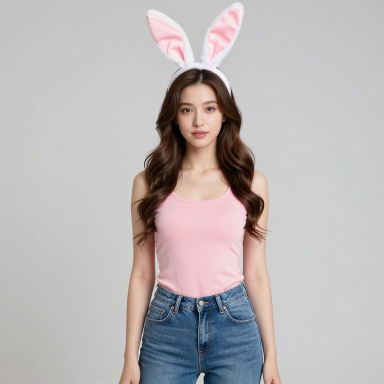 A young woman with long flowing hair wears a soft pink tank top paired with high-waisted blue jeans. She accessorizes with fluffy white and pink bunny ears headband, standing confidently against a plain light gray background.