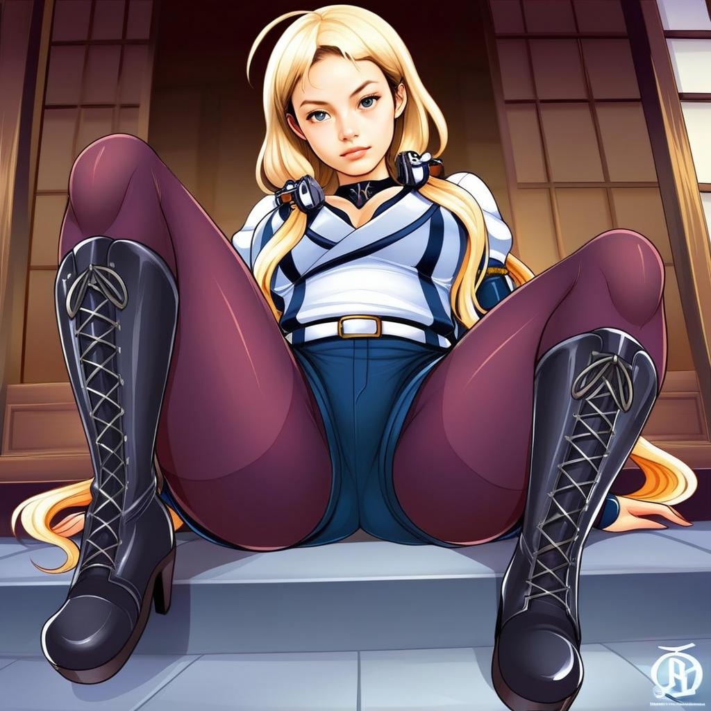 This digital illustration features a confident young woman seated with legs apart in a stylized anime art style inspired by traditional Japanese themes. She wears detailed clothing including a white and blue outfit paired with dark purple leggings and knee-high lace-up boots, set against a backdrop of sliding shoji doors. The vibrant colors and sharp linework highlight the character's expressive blue eyes and blonde hair, showcasing a blend of modern and classic elements.