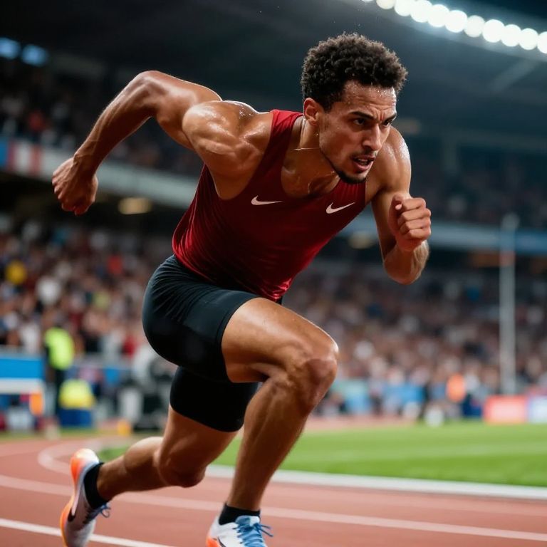 A male athlete in a red sleeveless top and black shorts is captured in mid-sprint on a professional track during a competition, showcasing intense focus and muscular power. The stadium background is filled with blurred spectators, emphasizing the high-energy atmosphere of the event.