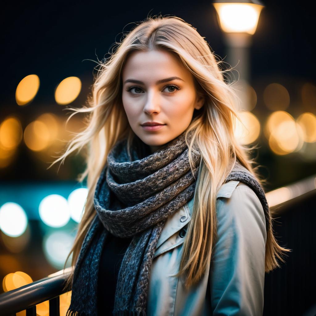 Blonde Woman in Scarf with City Lights Bokeh Background at Night