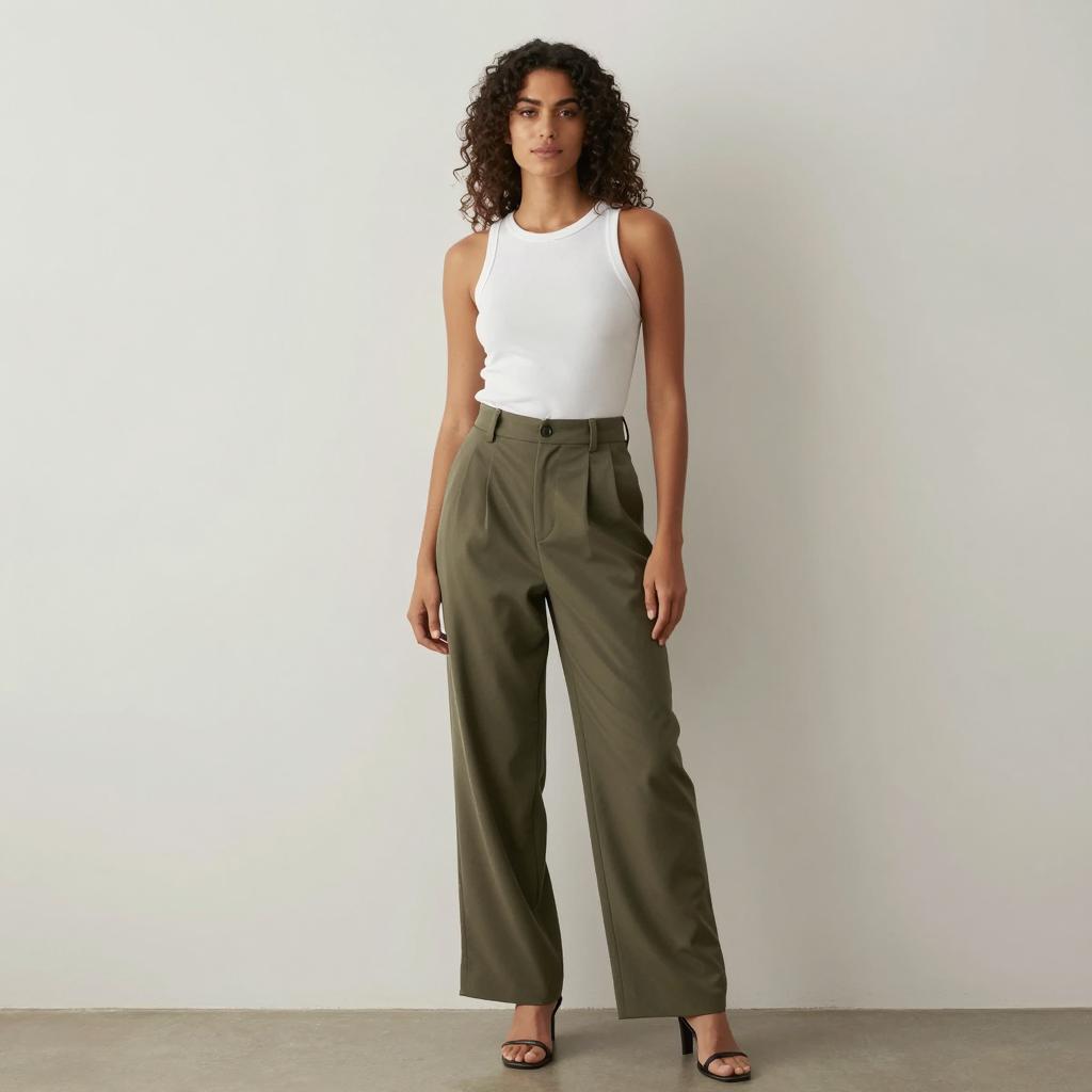 Modern Casual Chic: Woman in White Tank Top and Olive Green Wide-Leg Trousers