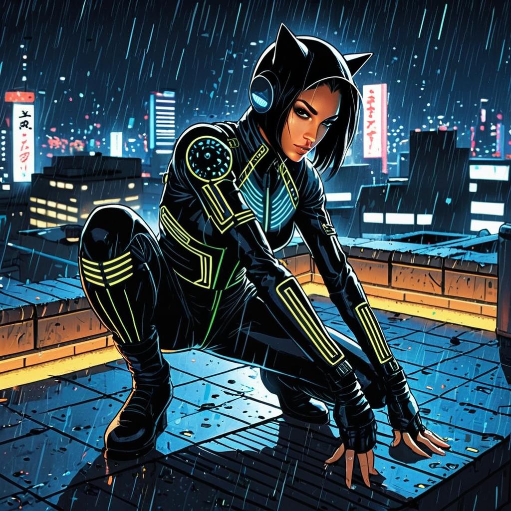 A fierce woman dressed in a futuristic black bodysuit with neon circuitry patterns crouches on a rain-soaked rooftop in a cyberpunk cityscape. The artwork features a dynamic, stylized digital painting style with strong contrasts, vibrant colors, and detailed urban lighting under heavy rainfall.