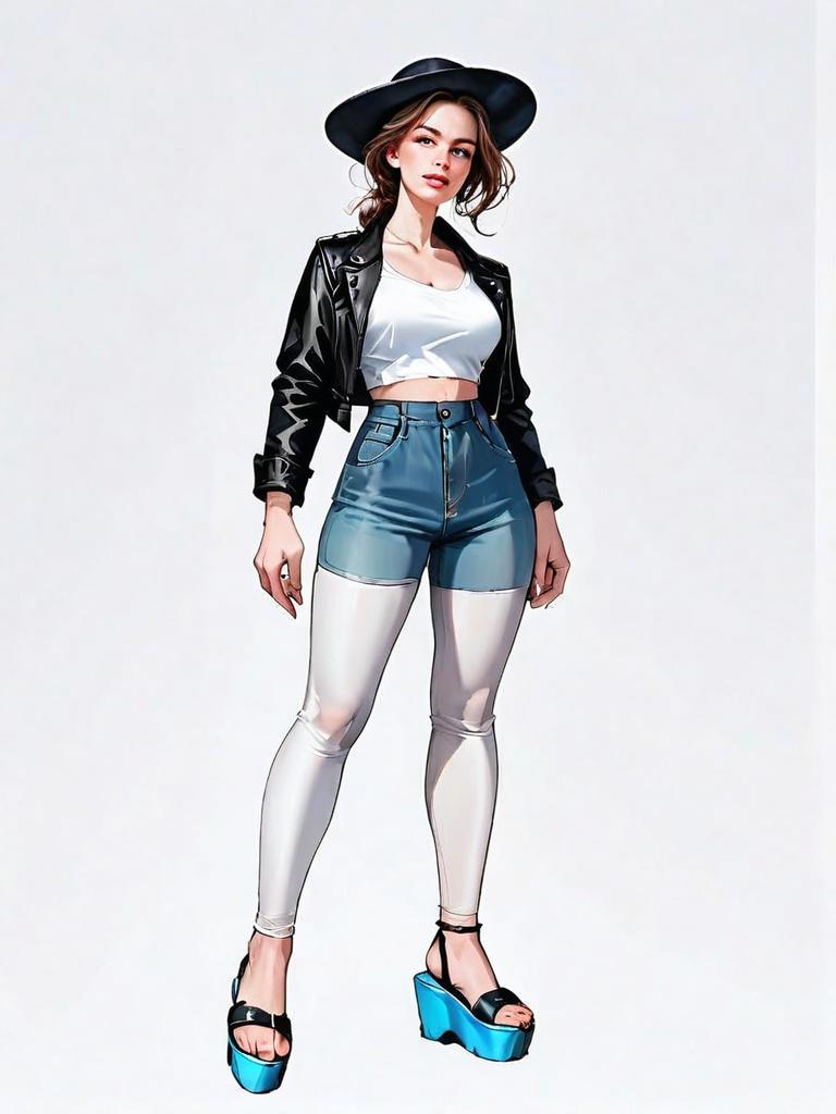 This is a realistic digital illustration of a confident young woman wearing a black cropped leather jacket, white crop top, high-waisted denim shorts, and white leggings. She completes the look with a wide-brimmed hat and blue platform sandals, standing in a casual full-body pose against a plain background. The artwork combines a comic-inspired style with photorealistic shading and detailing, emphasizing fashion and attitude.