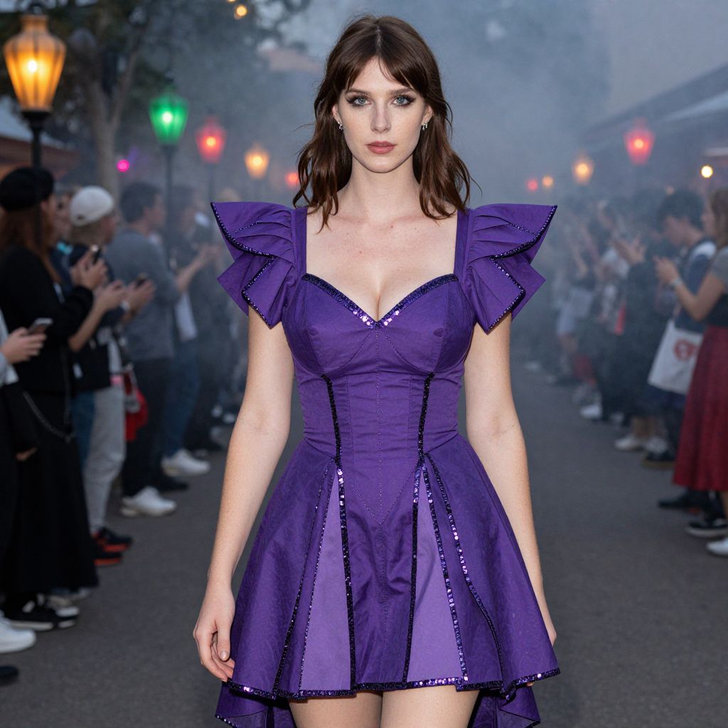 A woman walks confidently down a misty outdoor runway, wearing a striking purple dress with ruffled shoulders and sequin accents that add a touch of glamour. The setting features softly glowing colorful lanterns and a blurred audience, creating a mysterious and enchanting atmosphere. The overall style combines modern fashion with whimsical, theatrical elements.