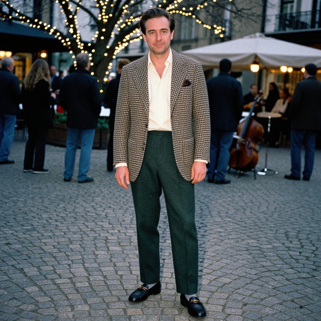 A man stands confidently in an outdoor plaza adorned with string lights wrapped around a tree. He wears a classic houndstooth blazer paired with dark green trousers and black loafers, exuding timeless, sophisticated style reminiscent of vintage menswear fashion. The background shows a casual evening gathering with blurred figures and string lights adding warmth to the scene.