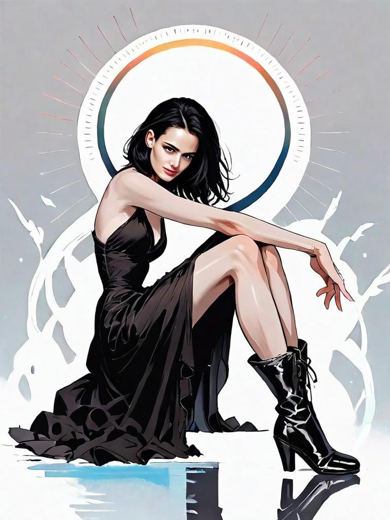 A striking digital illustration of a woman in a sleek black dress and shiny heeled boots, sitting with an elegant yet edgy posture. The artwork features a realistic comic style with sharp lines and smooth shading, set against a minimalistic background with a radiant circular halo that adds a mystical, contemporary vibe.