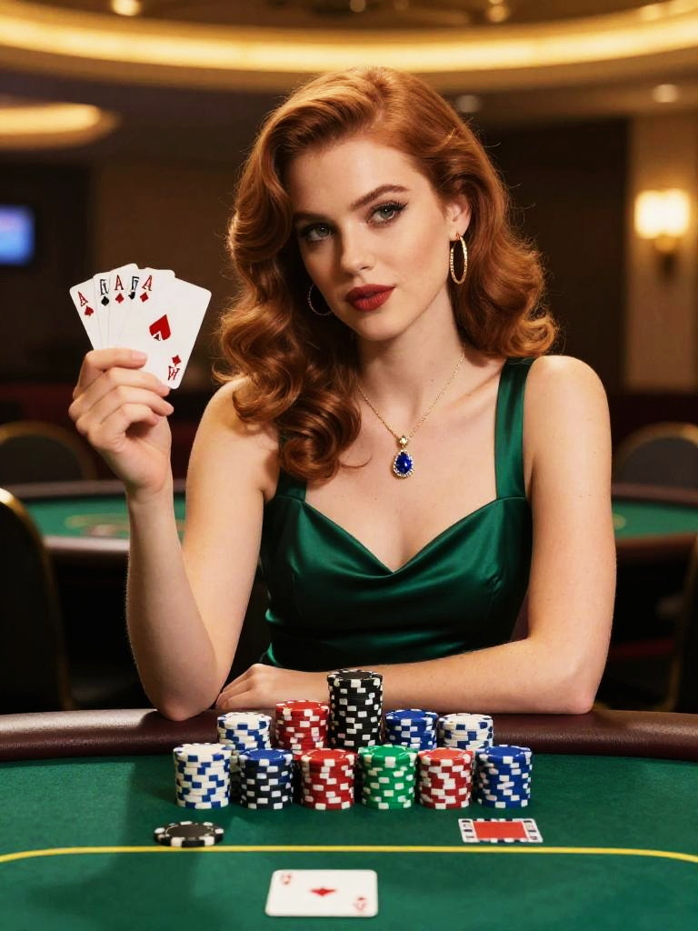 A confident woman with red hair styled in vintage waves, dressed in an elegant green satin dress, holds a royal flush of aces and fours in a poker game. She sits at a casino poker table surrounded by colorful stacks of chips, exuding a glamorous and classic casino atmosphere.