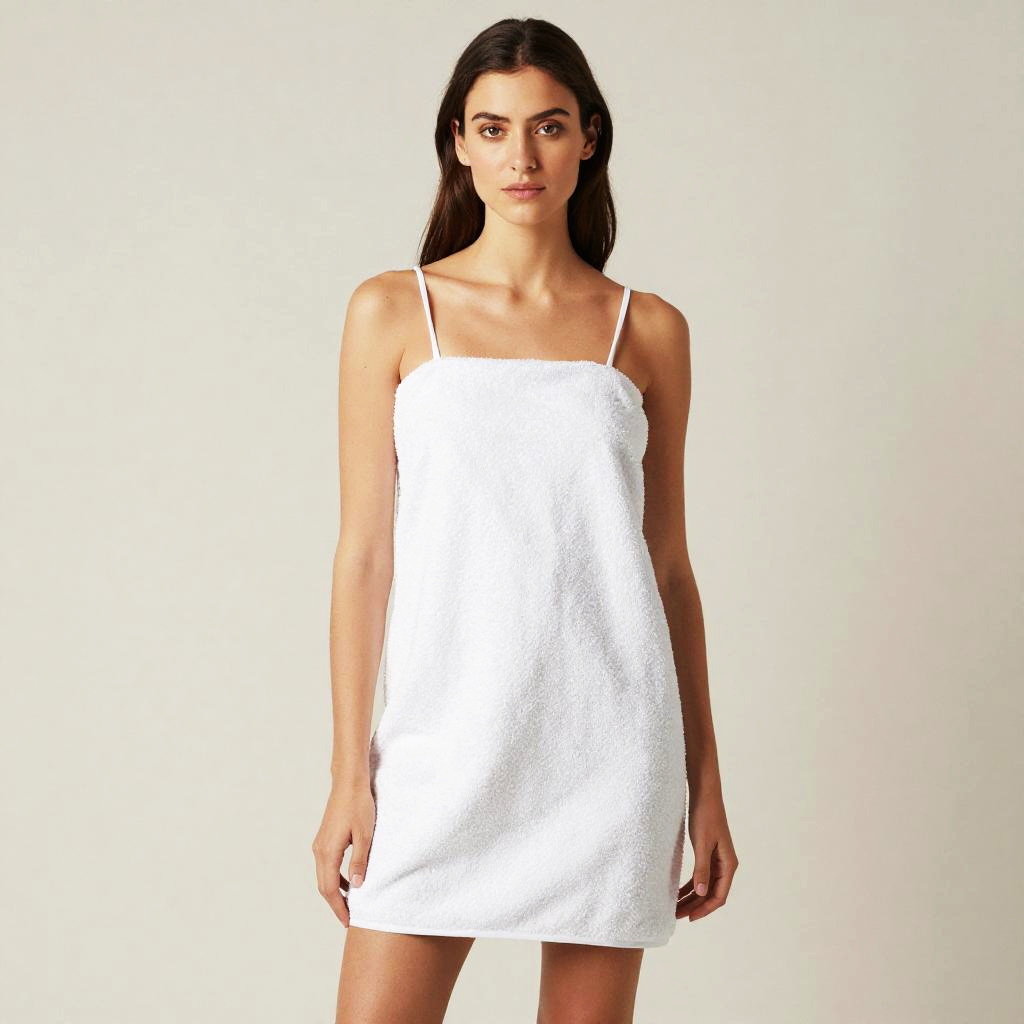 A woman stands confidently wearing a Zimmermann towel dress, characterized by its white terrycloth fabric and minimalist spaghetti straps. The simple, elegant design highlights a casual yet stylish look perfect for resort or lounge wear.