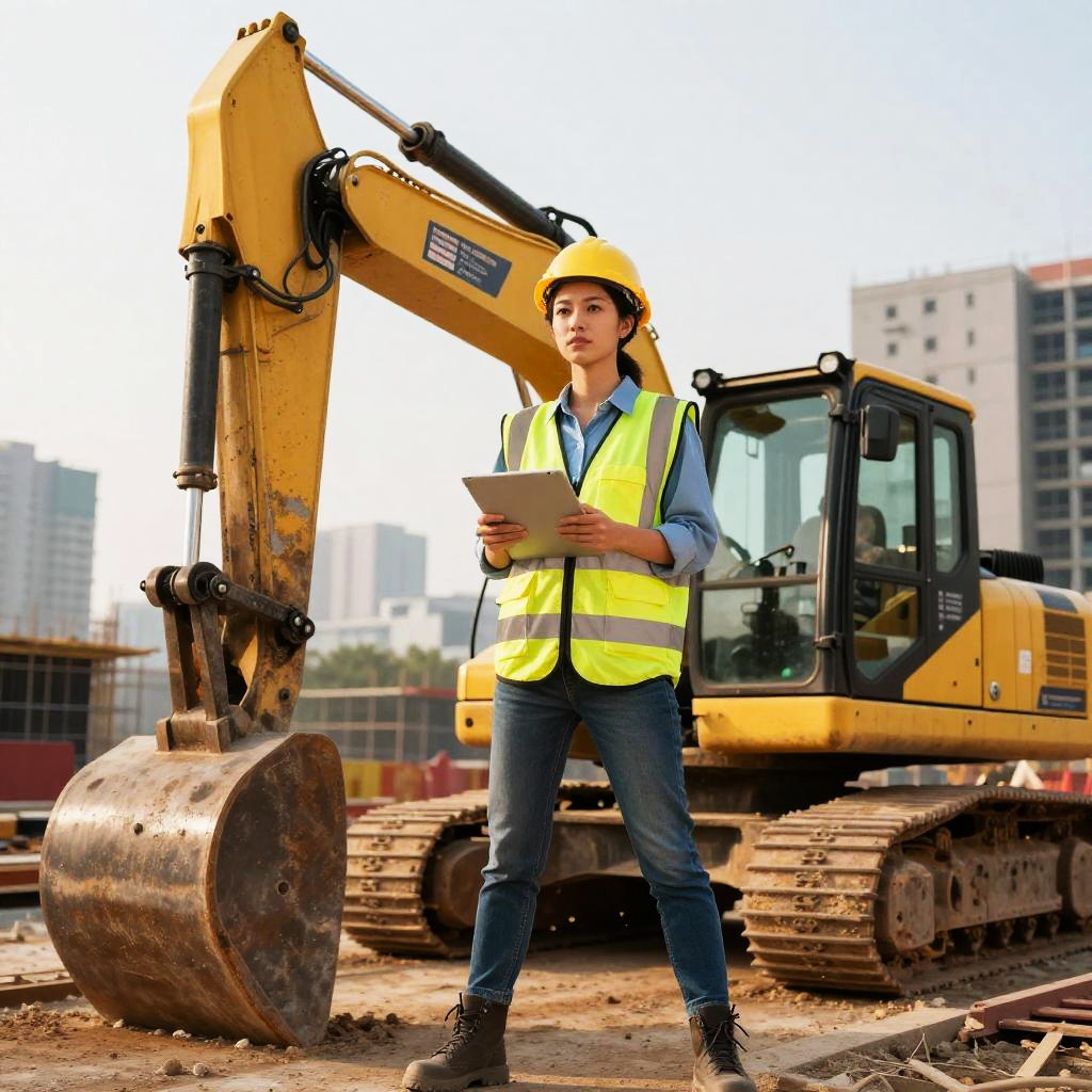 A confident young woman wearing a yellow safety helmet and reflective vest stands on a construction site holding a tablet. Behind her is a large yellow excavator, with urban buildings visible in the background, representing modern construction and engineering work.