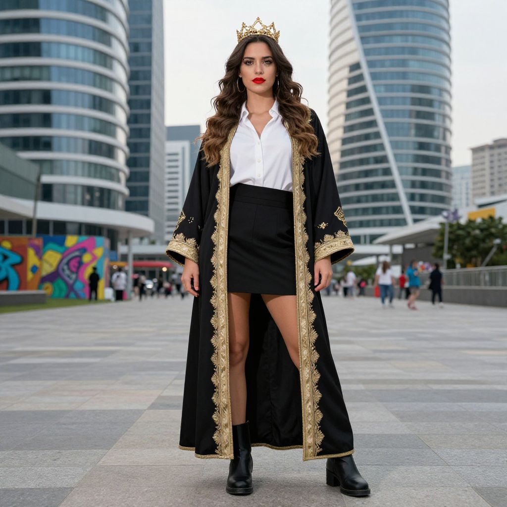 A confident woman stands outdoors in an urban setting wearing a stylish black and gold embroidered abaya paired with a white blouse, black skirt, and black boots. The modern cityscape with distinctive curved buildings frames her, blending traditional fashion with contemporary surroundings.