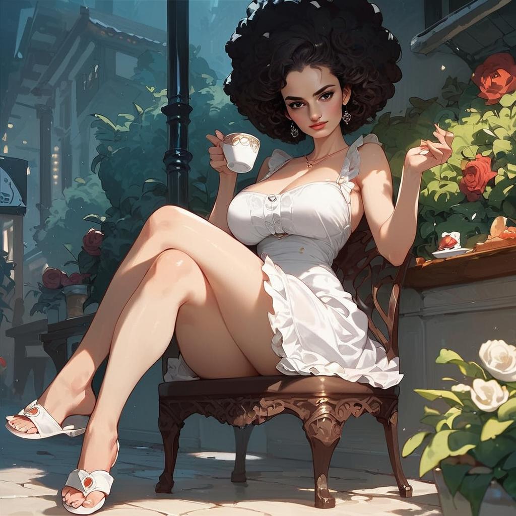 A digitally illustrated woman with voluminous curly hair sits elegantly on an ornate chair in a garden setting, holding a delicate teacup. She is dressed in a stylish white dress and sandals, surrounded by lush greenery and blooming roses, rendered in a detailed, semi-realistic anime art style.