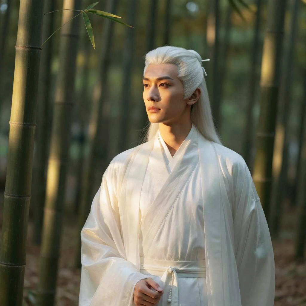 A man dressed in traditional white Hanfu clothing stands gracefully in a bamboo forest, exuding a serene and contemplative aura. His long, white hair and elegant attire highlight an ancient Chinese style, capturing the timeless beauty of classical East Asian culture.