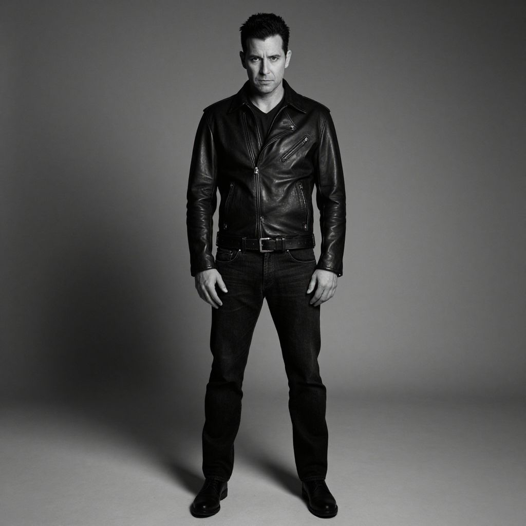 A confident man stands facing the camera wearing a classic black leather jacket and dark jeans, set against a plain grey background. The monochromatic style and straightforward pose highlight a timeless, edgy fashion aesthetic.