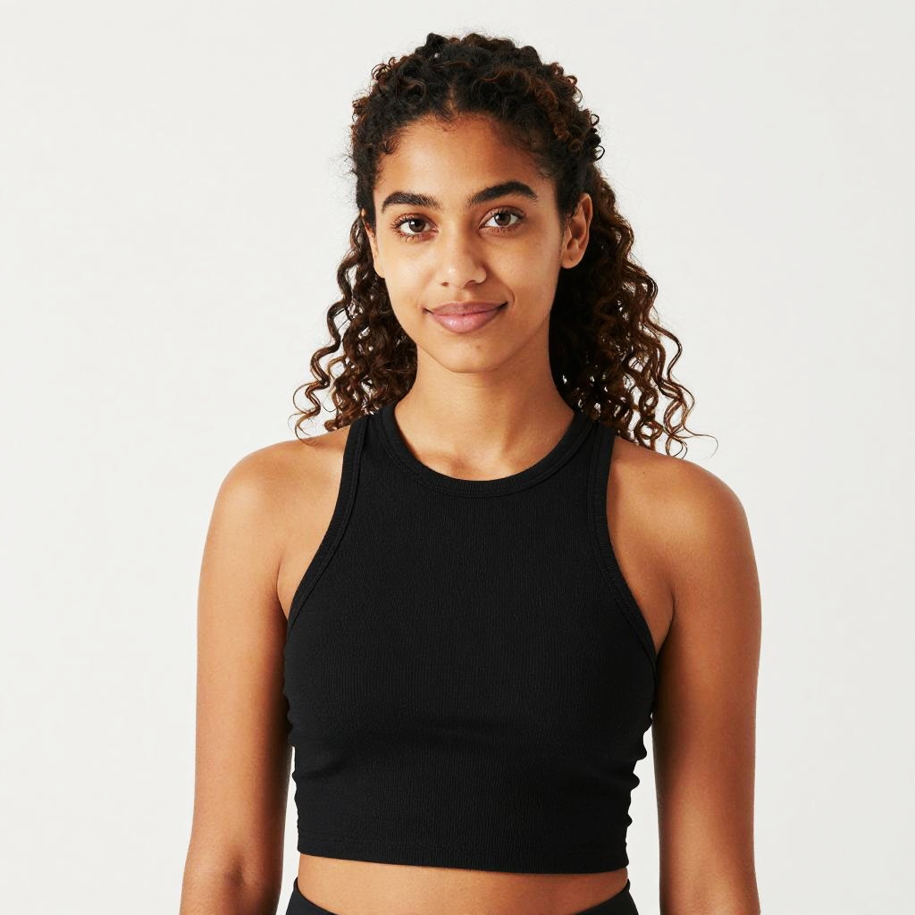 A young woman with curly hair wears a black cropped tank top, smiling softly against a plain white background. The image captures a fresh and natural look, emphasizing casual and modern style appealing to Gen Z fashion trends.