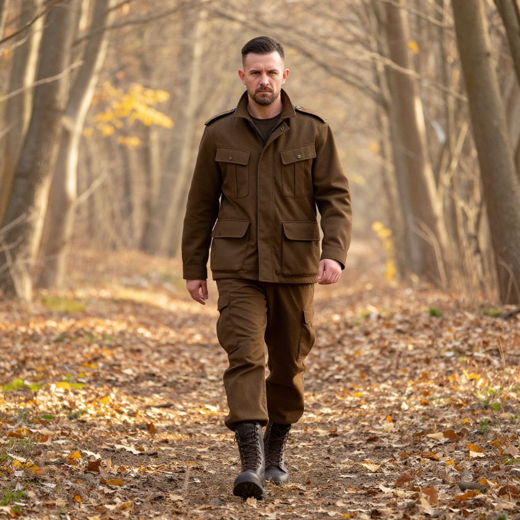 A man dressed in brown tactical clothing walks confidently along a forest path surrounded by leafless trees and fallen autumn leaves. The scene captures a rugged, outdoor atmosphere with soft, natural lighting highlighting the earthy tones of the environment and the man's attire.