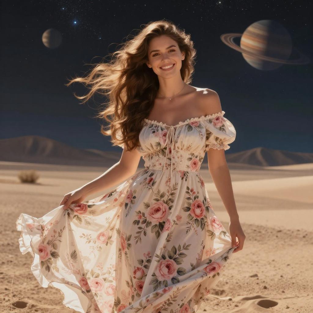 A joyful young woman stands gracefully in a desert landscape under a starry night sky, wearing a flowing floral off-shoulder dress. Surreal planets with rings float in the background, blending natural beauty with cosmic fantasy in a style reminiscent of contemporary digital art and photo manipulation.