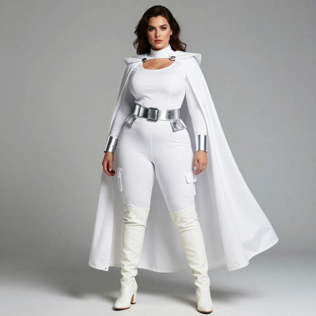 A confident woman stands wearing a sleek white jumpsuit with a futuristic design, complemented by a flowing cape and shiny silver belt and cuffs. Her tall white boots and poised stance enhance the modern, heroic aesthetic, blending elements of sci-fi and contemporary fashion.