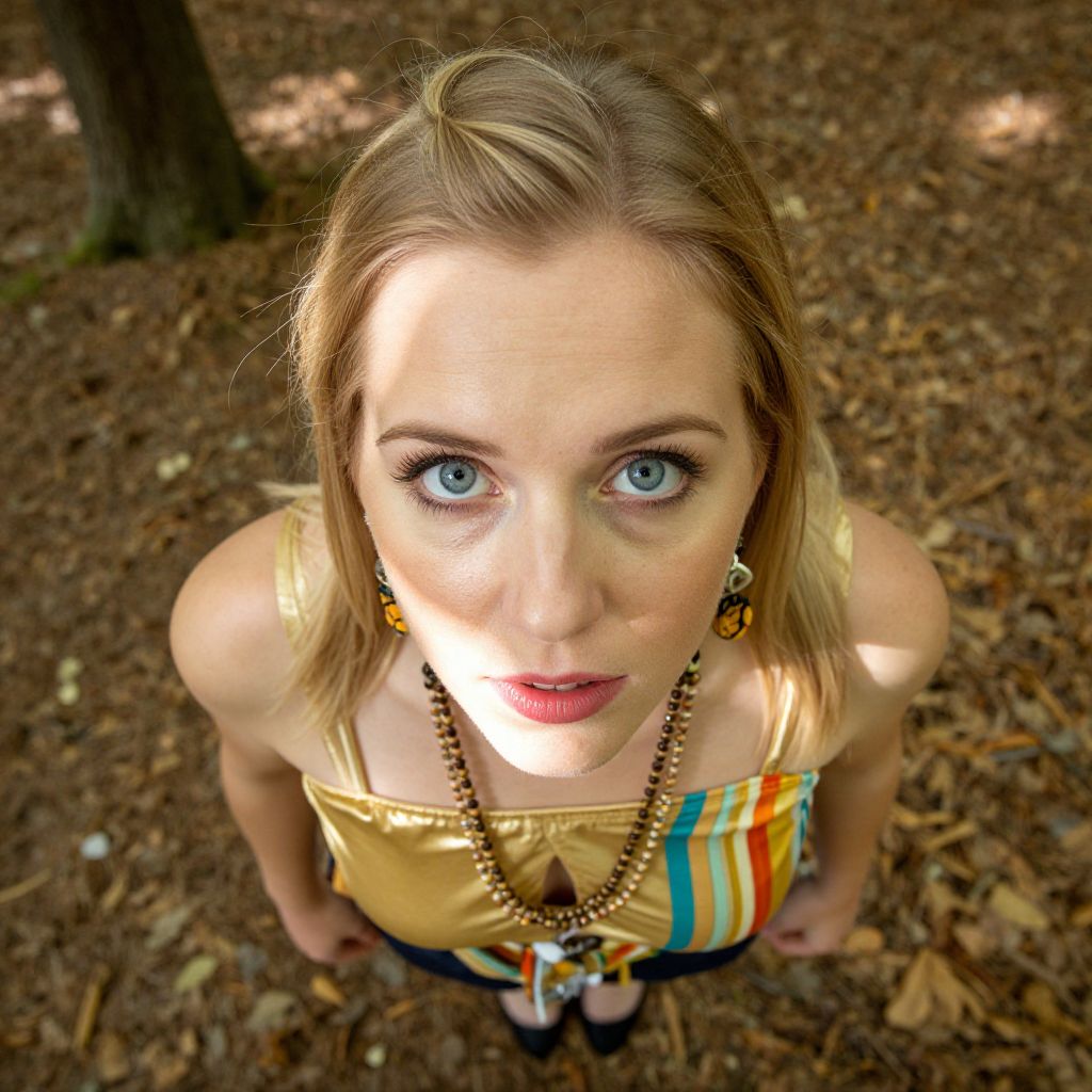 A young woman with striking blue eyes looks up directly at the camera in a close-up shot taken outdoors on a leafy forest floor. She wears a colorful, patterned top with a beaded necklace and matching earrings, with soft natural light casting gentle shadows across her face.