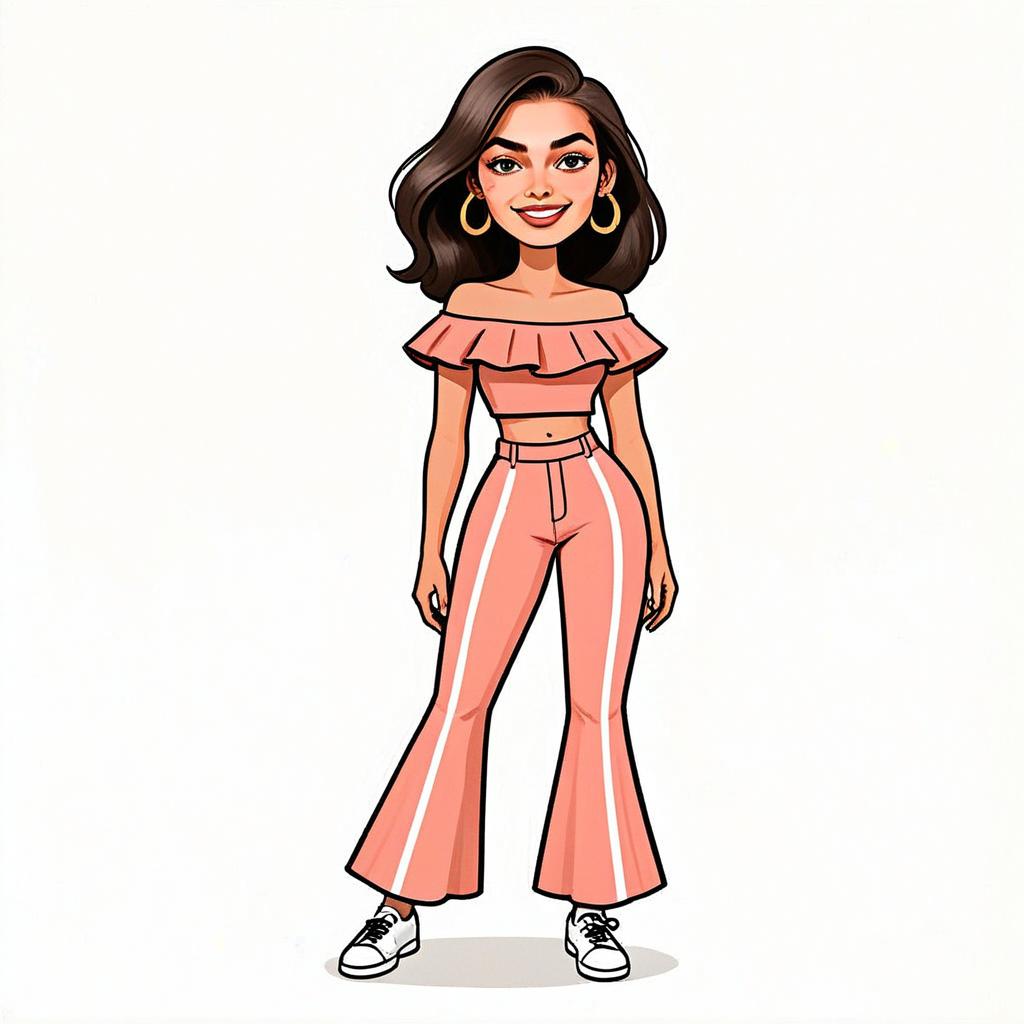 This vibrant cartoon-style illustration features a confident woman with a playful smile and stylish hair. She is dressed in a trendy off-shoulder ruffled top paired with high-waisted, flared pants with white stripes, completing her look with hoop earrings and casual sneakers.