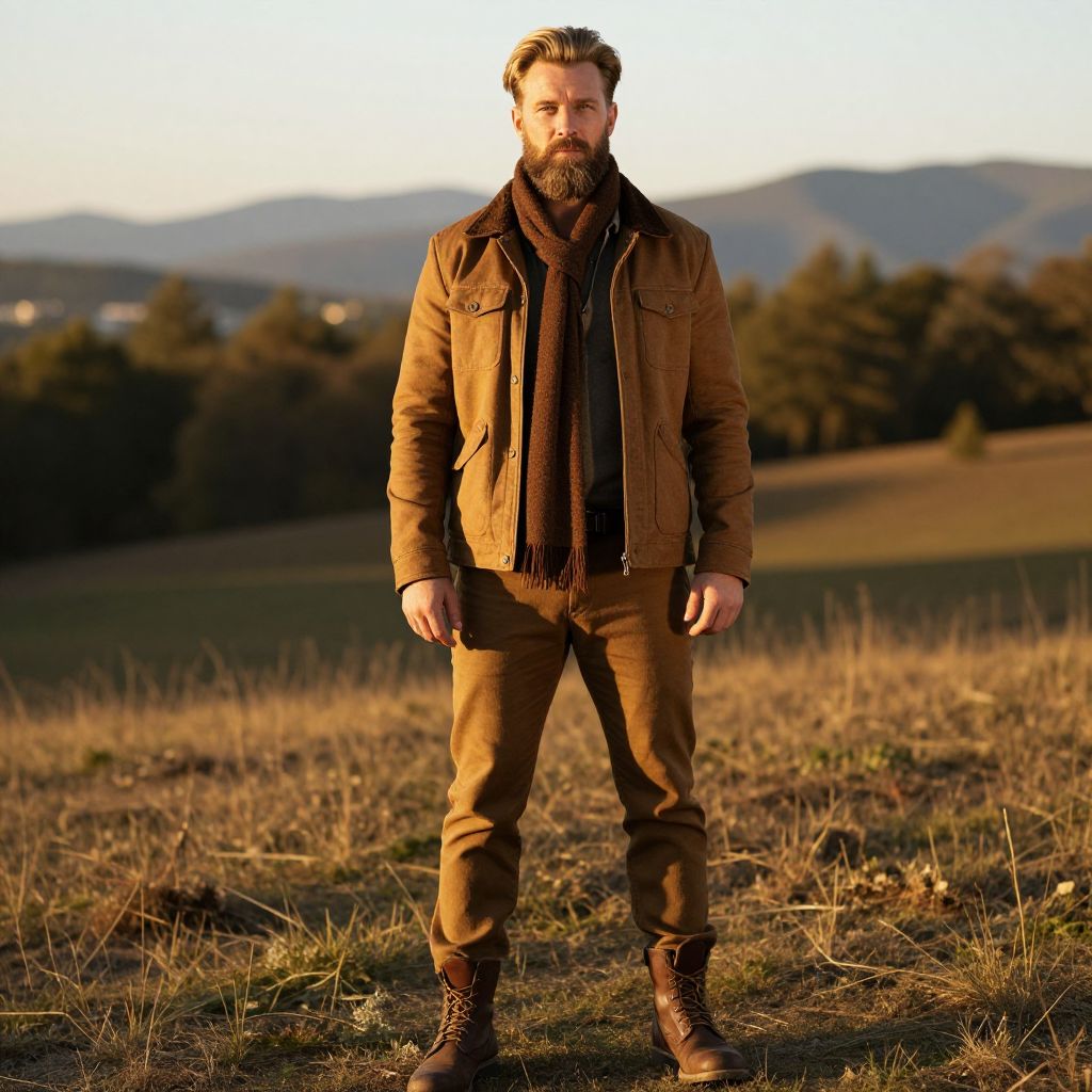A bearded man dressed in a brown jacket, matching pants, and lace-up boots stands outdoors in a field during golden hour. The warm sunlight highlights his rugged style complemented by a dark scarf, with hills and trees softly blurred in the background.