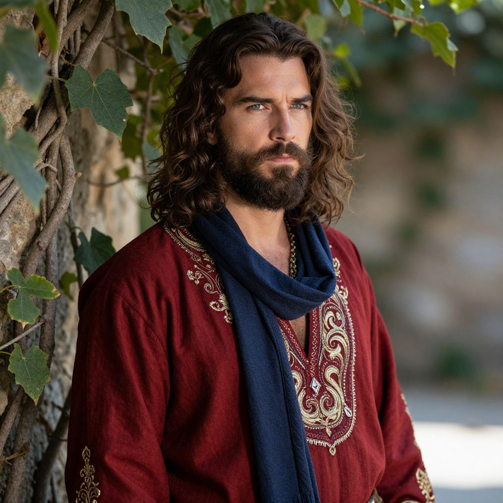 A man with long curly hair and a beard poses outdoors against a background of ivy-covered stone. He wears a richly embroidered red tunic paired with a dark blue scarf, evoking a bohemian or medieval-inspired style with intricate detailing.