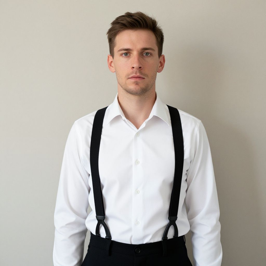 A young man dressed in a crisp white shirt and black suspenders stands against a plain beige background. His neutral expression and classic attire convey a timeless, formal style.