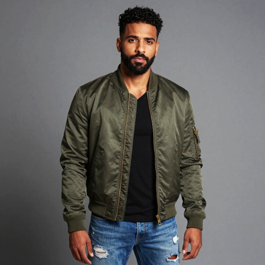 A man with a beard and curly hair stands confidently against a plain gray background, wearing a stylish olive green bomber jacket over a black shirt paired with ripped blue jeans. The casual and modern outfit reflects a trendy, urban street style favored by Gen Z.