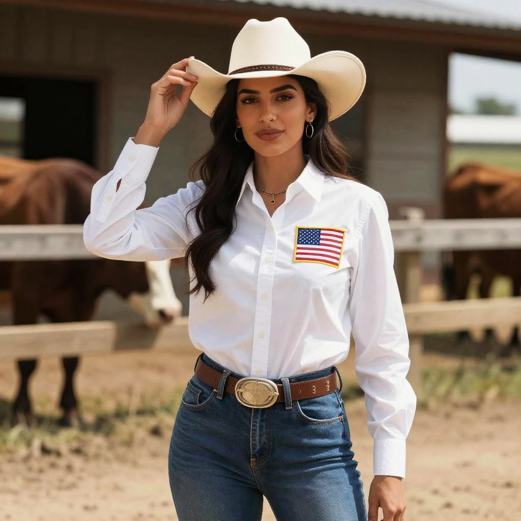 A confident woman dressed in a classic cowgirl outfit stands outdoors near a ranch stable, wearing a white cowboy hat, a white shirt adorned with a patch of the American flag, and blue jeans accentuated with a decorative belt buckle. The rustic background with horses and wooden fencing enhances the authentic Western aesthetic of the scene.