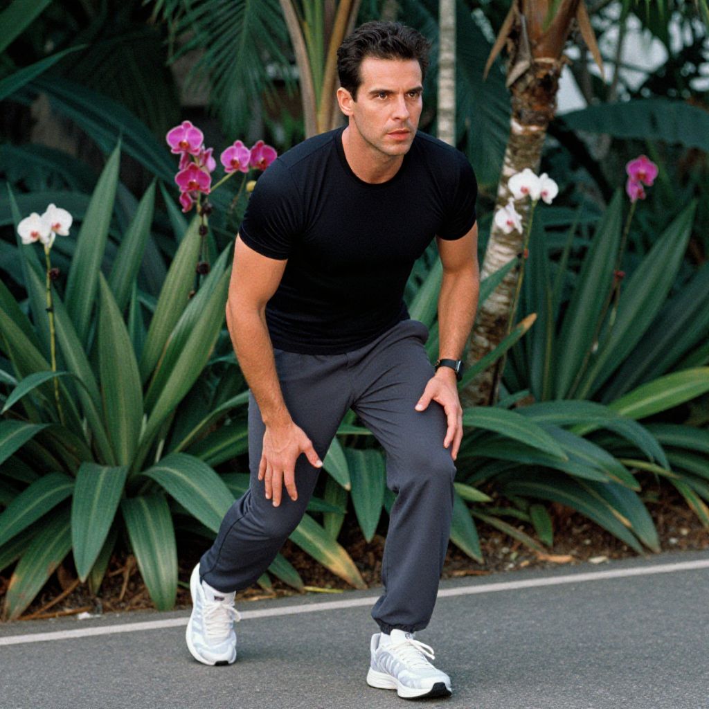 A focused man dressed in a black t-shirt and gray sweatpants is captured in a dynamic stretching pose on a pathway lined with lush green plants and colorful orchids. The natural outdoor setting highlights his dedication to fitness and warm-up exercises.