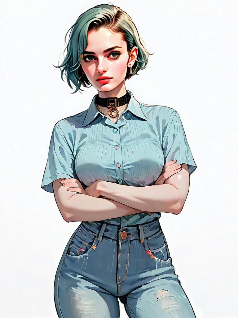 This illustration features a confident young woman with short teal hair, dressed casually in a light blue button-up shirt and high-waisted ripped jeans. Rendered in a realistic comic style, the artwork emphasizes sharp details and expressive facial features with a modern, vibrant color palette.