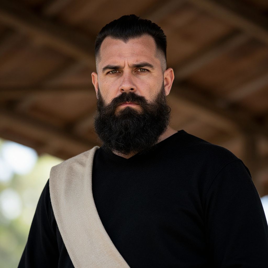 A serious bearded man with a neatly styled haircut and a full beard stands confidently wearing a black shirt and a light beige scarf draped over one shoulder. The image captures a strong, contemplative expression against a softly blurred background, emphasizing the subject's facial features and grooming.