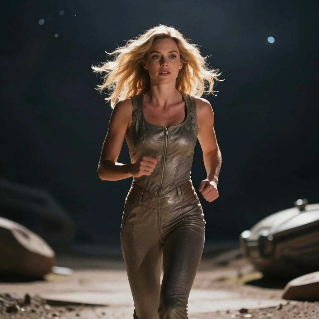 A determined woman with flowing blonde hair runs confidently in a sleek, form-fitting silver jumpsuit, set against a dark, futuristic backdrop with subtle lighting that enhances her focused expression. The image captures a dynamic moment, suggesting action or sci-fi adventure with its modern, high-tech aesthetic.