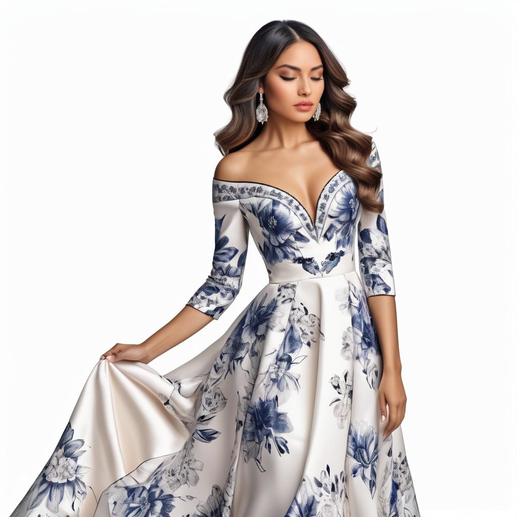 A stunning woman poses elegantly in a light blue evening gown with intricate detailing and a daring thigh-high slit. The soft lighting enhances the gown's flowing fabric, creating a captivating and glamorous atmosphere, perfect for fashion and bridal themes.